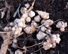 菊芋は秋に旬を迎えるキク科の野菜で、草丈は1メートルほどの長さに伸び、根はショウガのような形をしています。