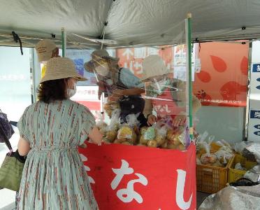 直売所では、販売開始前から買い求めるお客さんが並んでいました。また新型コロナウイルス感染症対策として、アルコール消毒や飛沫感染防止のためのフィルムシートなどが設置されていました。