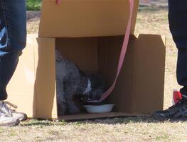2回目(実技編)は長坂谷公園との共催での実技編で、犬を伴った実技演習が行われました。しつけ方の基本である「アイコンタクト」「おすわり」「おいで」の練習や、発災時の生活を想定して「段ボールの上を歩く」「段ボールの中で食事」などの練習も行われました。