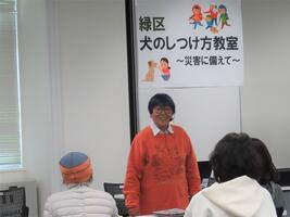 災害時に備えた犬のしつけ方を学ぶ教室を開催しました。3月2日・9日の全2回で、おくだ動物病院の獣医師でしつけインストラクターの越久田 活子先生を講師に招き、1回目(講義編)は緑区役所で、飼い主が災害に備えて準備することや心構え、犬の生態に基づいた基本的なしつけ方、災害発生時に必要となるしつけなど、多くの実例紹介を交えながらの講義が行われました。