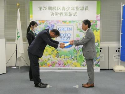 この表彰式は、今年3月末で緑区青少年指導員を退任された方のうち、継続して5年以上務められた方に対して、長年のご貢献への感謝の意を伝えるものです。