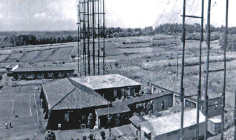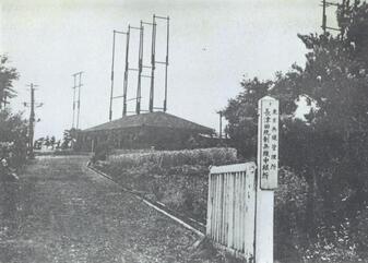 昭和16年2月、東京から博多までを結ぶ無線電話幹線を整備する計画が始まりました。今日の無線通信ネットワーク(伝送網)に繋がる革新的な超短波多重通信の新技術を実用化させた計画でした。この通信幹線を統制する端局として、標高が高く見通しの良い長津田辻の地に長津田統制無線中継所がつくられました。超短波無線を受信するアンテナ柱は木柱3本をつなぎ、25メートルの高さを確保しました。