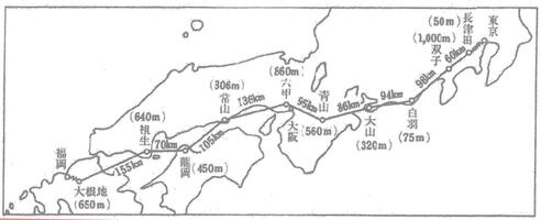 ▲「八丈回線」中継所設置図(『電気通信自主技術開発史 多重無線編』)※引用にあたり、図像を90度回転させています。