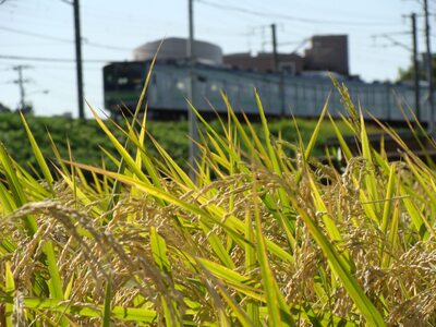 頭を垂れる稲穂とJR横浜線