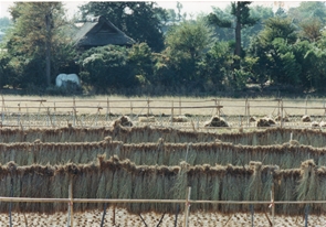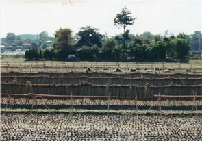 写真説明コメント:山下小学校前は一面田んぼが広がっていました。稲干しのあるのどかな風景でした。後方には観護寺 |