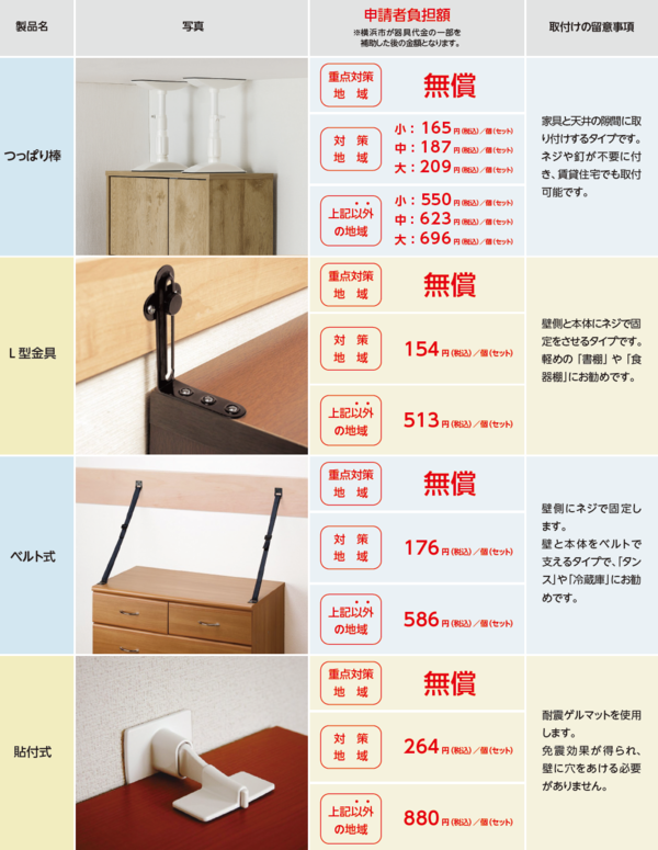 「横浜市密集市街地における地震火災対策計画」における重点対策地域にお住まいの世帯の方は、家具転倒防止器具の器具代を全額補助します。