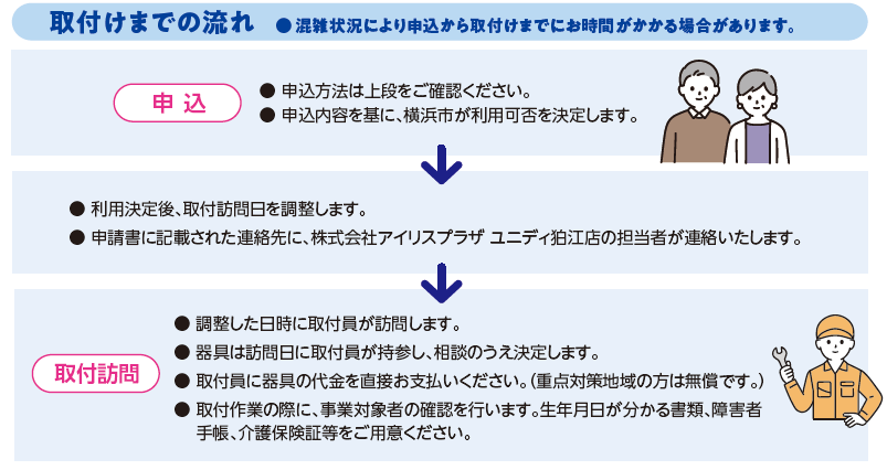 ・取付作業の際に対象世帯であることを書類で確認するため、生年月日が分かる書類・障害者手帳・介護保険証等をご用意ください。(写しの提出は不要です)