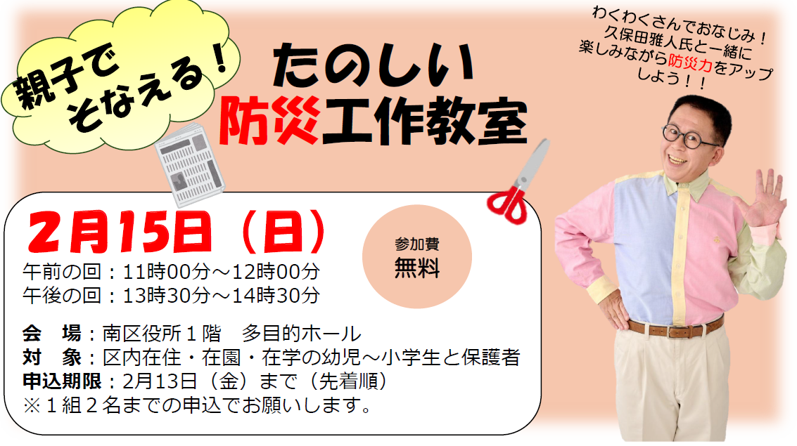 「わくわくさん」でおなじみの久保田雅人さんによる、身近なものを使った防災工作教室です。