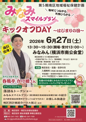 南区出身の落語家 春風亭かけ橋さんによる落語公演と、地元での思い出話、みなみスマイルプランにまつわるお話を伺います。