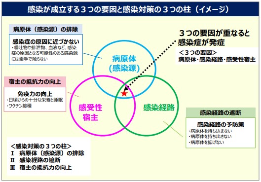 感染対策の3つの柱は、➊病原体(感染源)の排除 ➋感染経路の遮断 ❸宿主の抵抗力の向上です。