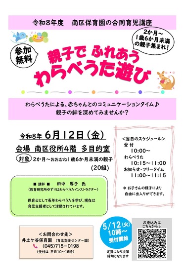 令和8年度 南区保育園合同育児講座「親子でふれあう わらべうた遊び」ポスター