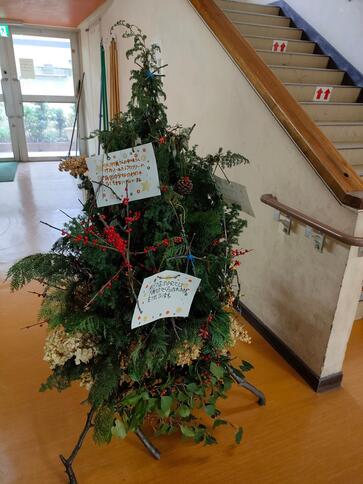 蒔田中学校の生徒のみなさんが、剪定枝を活用して制作したクリスマスツリーです。ツリーは、校内で展示していただきました。