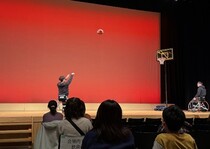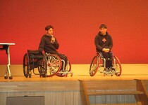講演の後は、競技用と普段使用している車いすの違いの解説や、車いすバスケットボールの実演がありました。また、古澤選手が所属している神奈川VANGUARDSの山下選手にも登壇いただき、ステージ上で迫力あるパフォーマンスを行っていただきました。車いすのぶつかる音が響き、客席からは歓声や拍手が沸き上がりました。