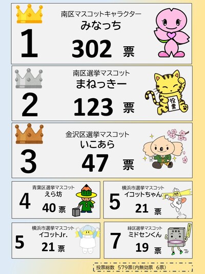 579票(うち無効票6票)の投票をいただき、1位は南区マスコットキャラクターの「みなっち」です。ご投票いただいたみなさま、本当にありがとうございました。
