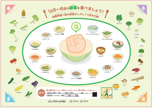 何をどのくらい食べたらよいか、和食の基本的な配膳位置、季節の野菜や地産地消情報などが楽しく学べるランチョンマットを作成しました。
