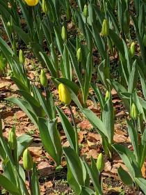 今日は少し風が冷たいですね。きれいに花開いているチューリップもありますが、高いところから見てみると、緑が目立ってきた印象を受けます。