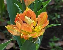チューリップも桜も咲きました!横浜公園はお花でいっぱいです。華やかな八重咲きのチューリップも咲いていました。いろいろな種類がありますね。つぼみが青いところもありましたので、これからもまだ楽しめますね。
