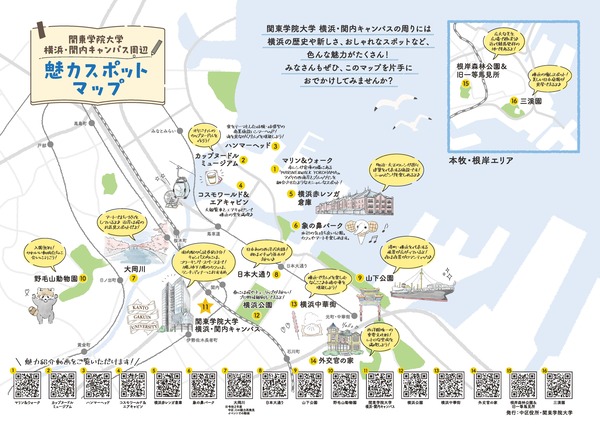 関東学院大学横浜・関内キャンパス周辺の魅力的な16のスポットをマップ形式で紹介しています。それぞれのスポットには二次元コードがついており、スマートフォン等で読み取ると、魅力紹介動画をご覧いただけます。