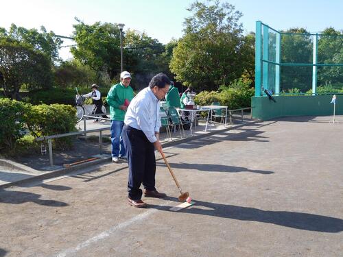 齊藤会長のご挨拶の後、小林中区長による始球式でプレーが始まりました。
