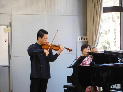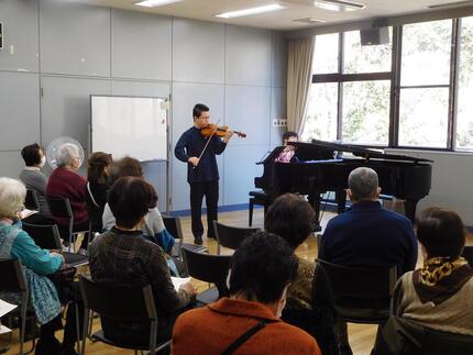 今年は本牧地区センターの2階音楽室で、本牧にお住まいの宮下先生と横浜市出身の杉山先生によるピアノとヴァイオリンの演奏会が開かれました。