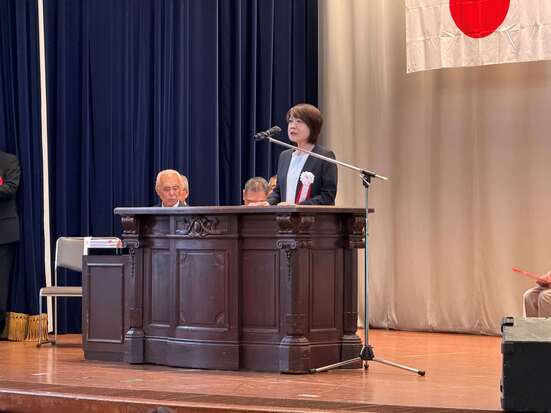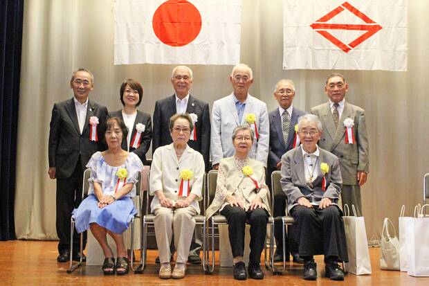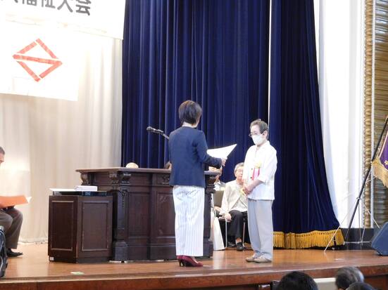 第一部の式典では、長年にわたり老人クラブの会長を務めた皆様の表彰を行いました。来賓の皆様をはじめとする参加者全員で、受賞者の皆様の功績を称え盛大に祝福しました。