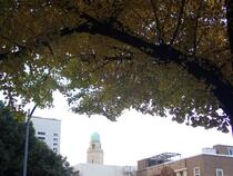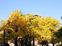 横浜公園から眺めると、緑との対比で黄色く見える日本大通りのイチョウ並木。でも色づき方は木によってさまざまです。紅葉一番乗りのイチョウの木はお隣の木に半分かくれていますが、とても目立ちますね。