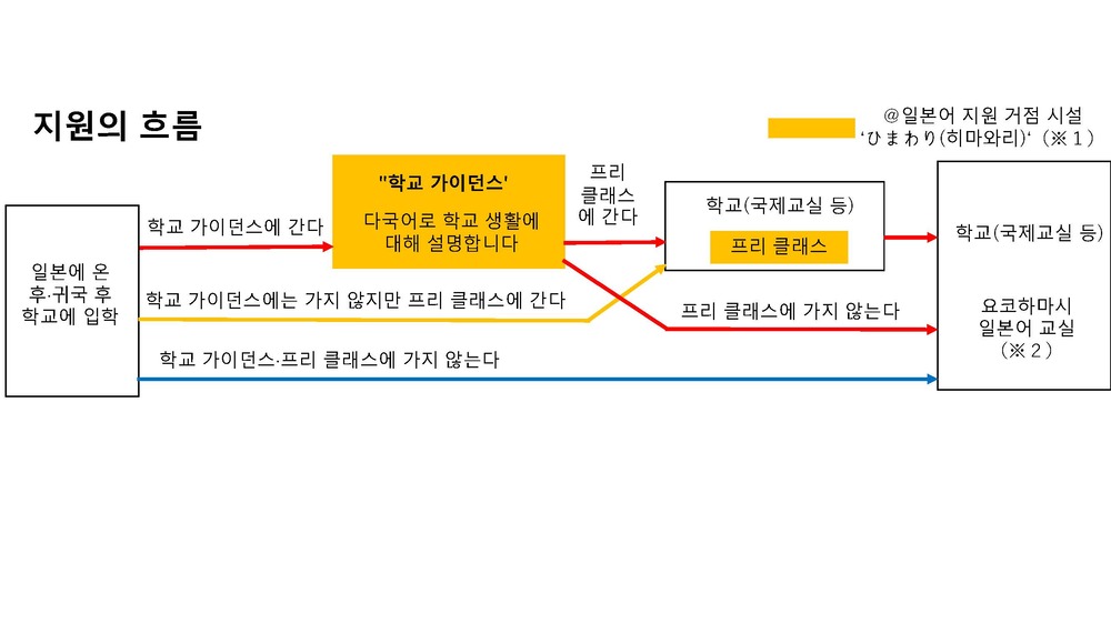 요코하마시는 일본어 지도가 필요한 초, 중학생을 대상으로 학교 내에서는 국제교실에서의 지도, 학교 밖에서는 일본어 지원 거점시설 'ひまわり(히마와리)'에서 다국어로 학교 가이던스나 일본어 지도 등을 실시하고 있습니다.