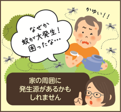 모기는 뎅기열이나 지카바이러스 감염증 등, 다양한 감염증을 매개합니다. 감염된 사람의 피를 흡입한 모기에 물리면 이러한 감염증에 걸릴 위험이 있습니다. 모기 수를 늘리지 않기 위한 대책, 모기에 물리지 않기 위한 대책을 모두 실시합시다.