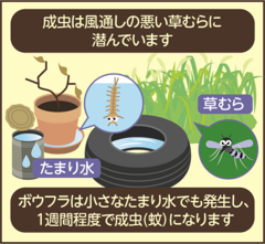 ・모기 유충(장구벌레)의 발생원이 되는 집 주위 물 웅덩이를 제거하세요.