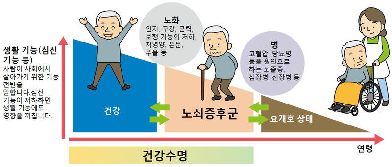 어원은 영어의 Frailty(허약)로 '건강'과 '요개호 상태'의 사이를 가리키는 말