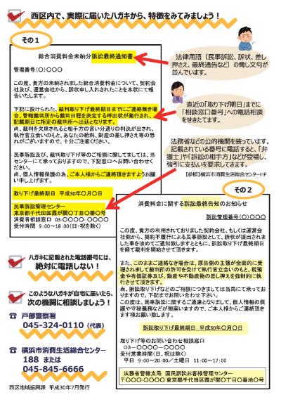 西区内で、「法務省管轄支局」や「民事訴訟管理センター」等をかたり、ハガキで裁判や差し押さえを通告して、金銭を要求する架空請求詐欺が急増しています。