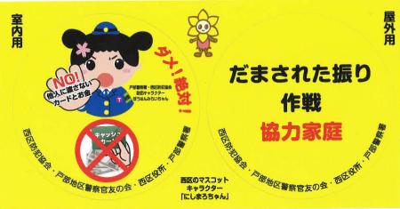 自宅にキャッシュカードや現金を取りに来る手口の被害を抑止するため、玄関ドアに貼って犯人を撃退するステッカーを作成しました。