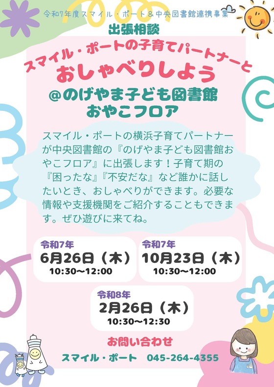 スマイル・ポートの横浜・子育てパートナーが中央図書館おやこフロアにて出張相談会を行います。
