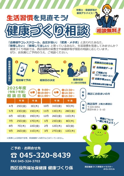 「血糖値やコレステロール、血圧が高い」「肥満・メタボ」と言われた方、「禁煙したい」「禁煙してほしい」と思っている方、生活習慣を見直してみませんか?健康づくり相談では、西区役所の栄養士や保健師等が個別の相談に応じています。
