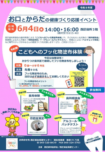6月4日から10日は「歯と口の健康週間」です。西区では6月4日(木曜日)に、歯と口の健康週間行事として西区歯科医師会の歯科医師による「こどもへのフッ化物塗布体験」や、子どもも大人も対象の「歯科相談会」保健師による大人対象の「骨密度測定」や「アルコールパッチテスト」、栄養士による「ベジチェック測定」など専門スタッフがみなさんの健康づくりを応援します!ぜひ、ご参加ください!