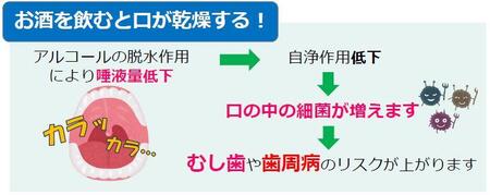 飲酒をすると、アルコールの脱水作用により唾液量が低下し、自浄作用が低下します。その結果、口腔内の細菌が増え、むし歯や歯周病のリスクが上がります。
