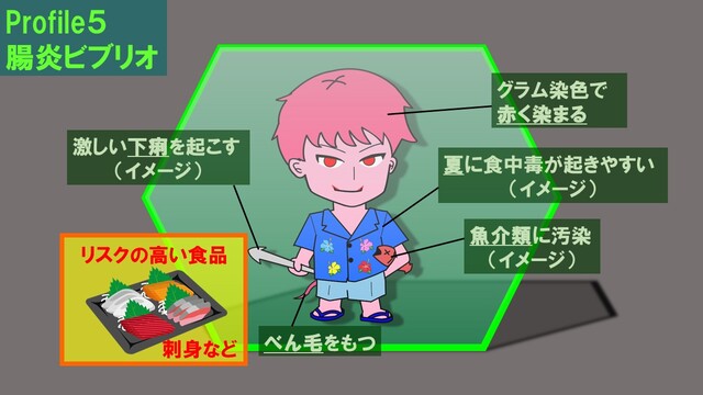 海底の泥の中に生息する塩分を好む細菌で、海水温が高い時期に獲れた魚介類の体表や内臓などに付着しています。他の食中毒菌よりも増殖が速く、漁獲後の温度管理が不適切だと食中毒の原因となります。