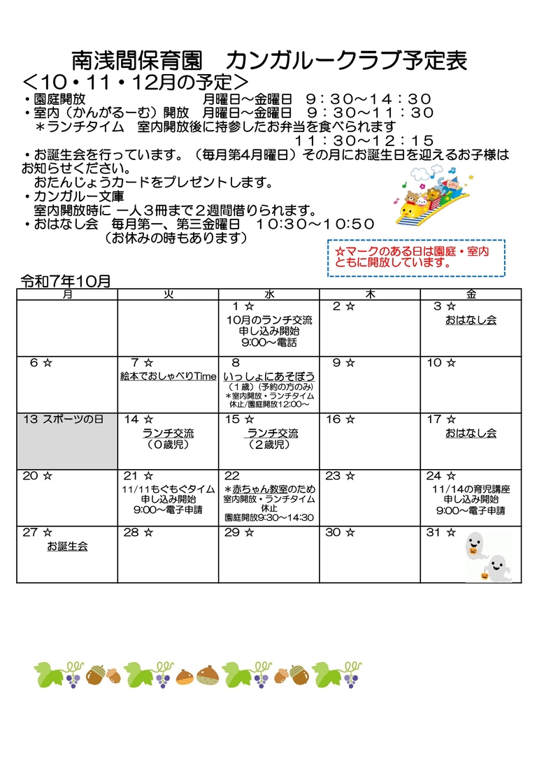 ご案内あるいは事業内容に掲載されている、予約が必要な事業の利用については、事前に電子申請あるいは電話にて南浅間保育園へご連絡ください。