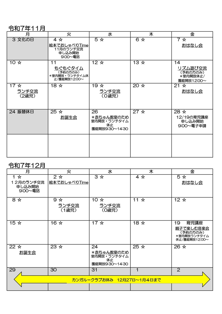 事業の詳しい日程や具体的な内容・詳細については「令和7年度カンガルークラブのご案内(PDF:655KB)」をご覧ください。
