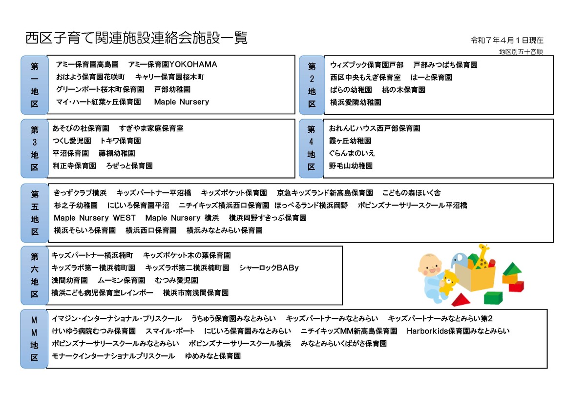 安心して、楽しく子育てができる地域づくりを目的とし、西区の保育所・幼稚園・子育て関連施設等が集まって活動しています。