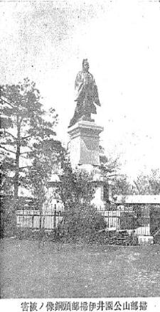 第二次世界大戦中は、政府の金属回収指示によって銅像が回収されました。桜などが燃料として伐採され、更に昭和20年5月28日の横浜大空襲により施設や樹木のほとんどが焼失し、残ったものも焼け焦げた状況となりました。
