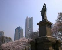 時を経て 、1884年旧彦根藩士が故井伊直弼大老の記念碑建立のために西区にある鉄道山を購入し、その25年後の1909年(横浜開港50年)に苦心の末、銅像を建立しました。銅像建立後、公園敷地と銅像は横浜市に寄付され、現在では鉄道山は井伊直弼の官職から「掃部山(かもんやま)公園」となりました。