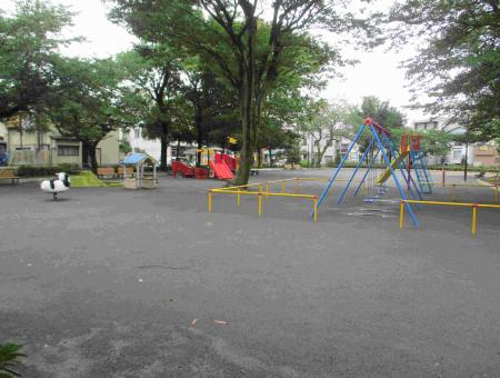 商店街に近く、にぎやかな公園です。大きなサクラの木々に囲まれたこの公園には、カラフルなコンクリート製遊具やお家の形をした遊具などがあり、小さな子供たちが砂場の周りで、おままごとなどをして楽しんでいます。