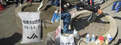 これから花が咲くフジに栄養を届けるため、油かす(骨粉)・牛ふん堆肥・バーク堆肥を1:1:2の割合で配合し、フジの根が広がっているところに輪状に穴を掘り、肥料を散布します。