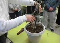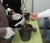 講習会開催日は時期が早く、はっきりした花芽が確認できませんでしたが、太い枝から出ている新しい枝の2から4芽または20cmから30cmくらいの位置で剪定をするよう、心がけて作業をしました。