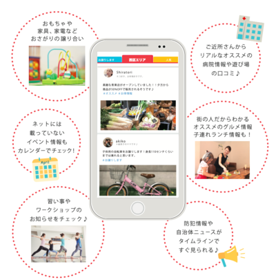 - 近隣のグルメ情報や病院情報、遊び場など、地域の口コミ情報を交換できます。