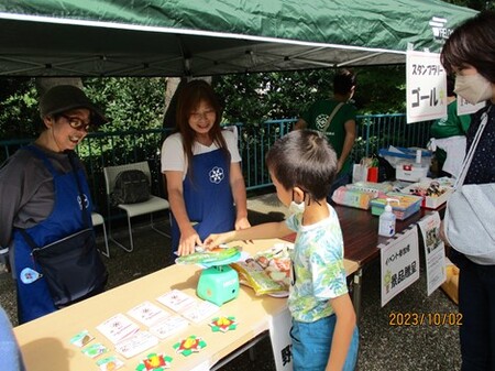 ゴール会場では、スタンプラリーに参加したお子さんへ折り紙でできた動物マスコットが配られました。また、1日の歩数の目安に関するパネル展示や1日の野菜必要量350gを測る野菜計量クイズ等が実施され、参加者は楽しみながらより健康でいるためのアドバイスを受けていました。