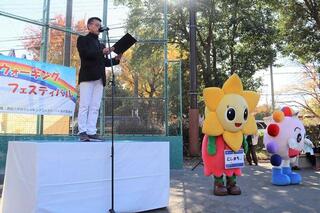 スタート会場では、応援に駆けつけてくれたコスモワールドの「コスモくん」と西区のマスコットキャラクター「にしまろちゃん」とともに、参加者の皆様をお見送りさせて頂きました。