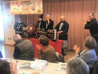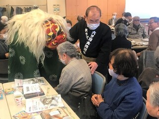 第二地区社会福祉協議会が中心となり、民生委員・児童委員などの皆様が、年間5回、開催してくださっています。毎回、季節にちなんだ出し物も参加者の楽しみです。今回は「お正月」の祝いを盛り上げる、お囃子と獅子舞の演舞がありました。太鼓や笛が賑やかに響きわたるなか、獅子が50名近い参加者を巡り元気づけてくださいました。お正月らしく華やかな雰囲気で、笑顔のたえない“なごみ”の会となりました。