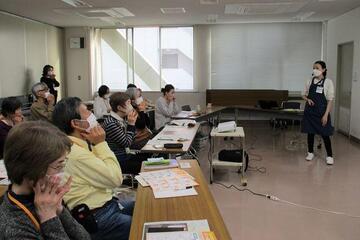 当日は、はじめに2月に実施した調理実習について、グループごとの発表がありました。どのグループも「働き・子育て世代」や「実りの世代」といった対象者の背景に合わせ、彩り豊かで栄養バランスよく食べることができるような工夫が凝らされていました。発表の後、受講生の皆様に修了証をお渡しいたしました。半年間の講座を修了した皆様の晴れやかな表情が大変印象的でした。